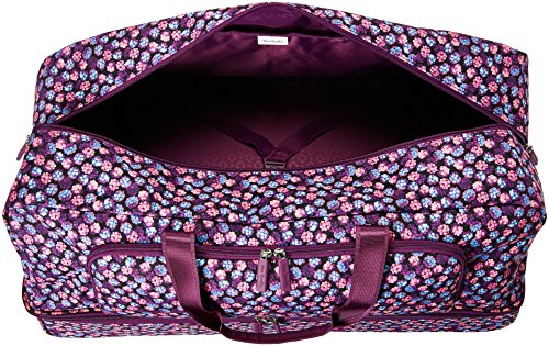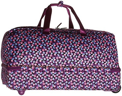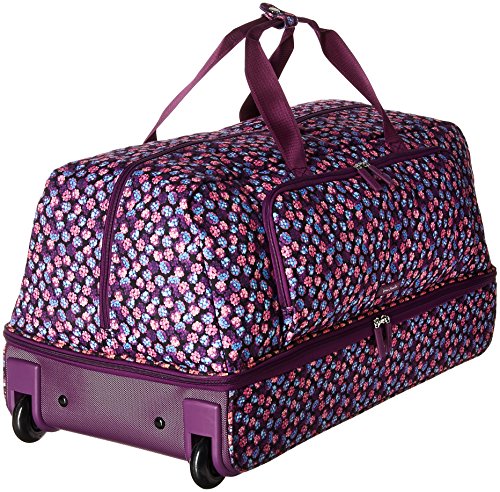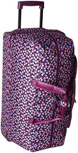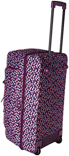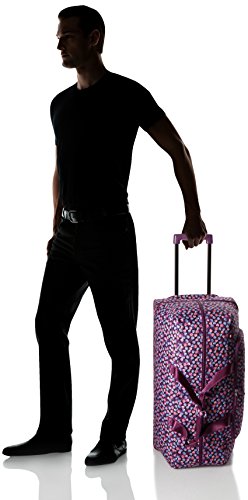 Details: Lighten up fabrication is lightweight, durable and water-repellent. Includes two large zip-around compartments. Main compartment has compression straps. Zip-around front pocket has a mesh zip pocket and two mesh slip pockets inside. Telescoping handle and roller wheels. Zip closure.