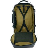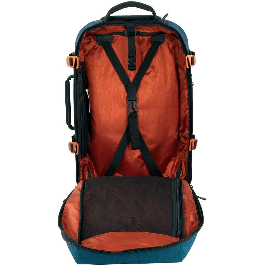 - Interior organization includes Y-shaped webbing compression straps, a large zippered mesh lid pocket and a zippered mesh side pocket containing a key fob and storage slots