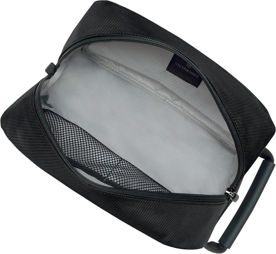 Zippered case features easy to clean lining and is ideal for storing full-size toiletries.