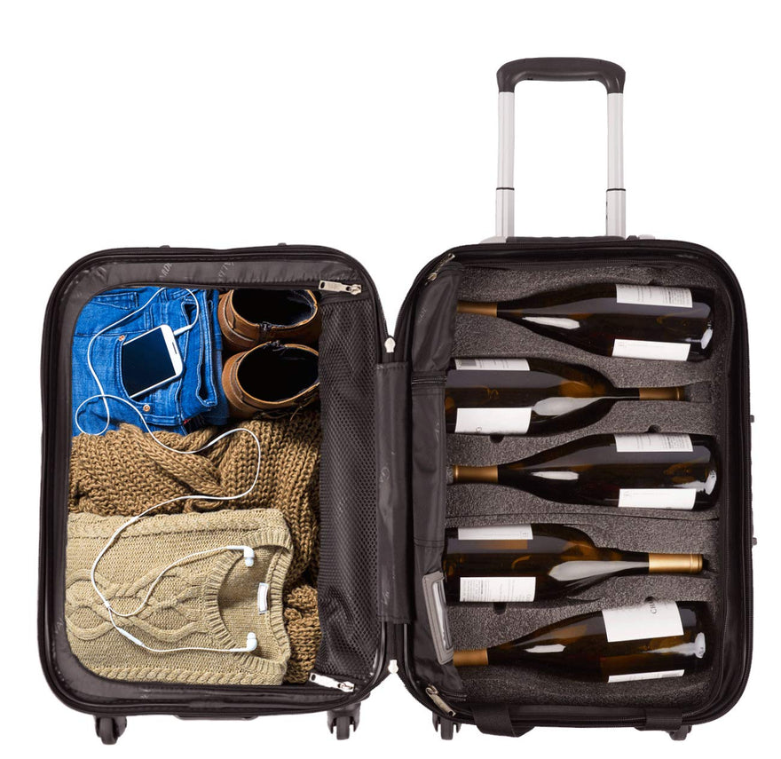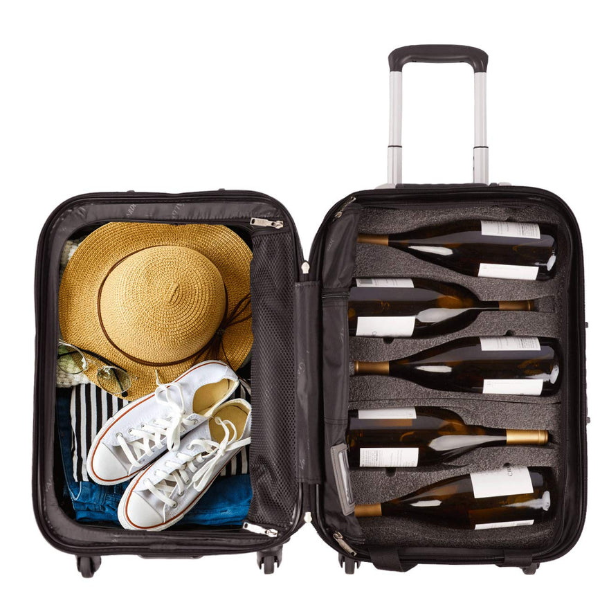 - Holds 5 bottles (750ml) of wine or spirits plus clothing. 2 separate removable inserts; 2-cavity and 3-cavity to accommodate a total of 5 regular size 750ml bottles.