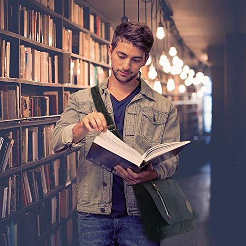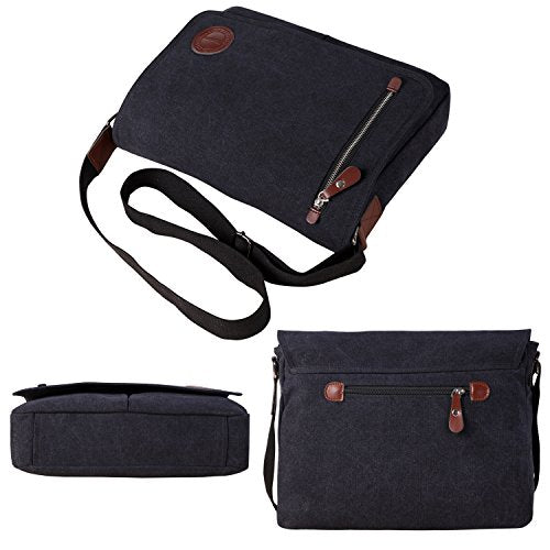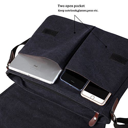 Details: Key Features: 1. Material: Waterproof and scratch-resistant canvas,100% imported leather,Smooth zipper, Rustproof metal; Lining: Polyester . 2. Dimensions size: 13.5"(L)*3.1"(W)*11"(H); Weight: 1.35 lb. 3. Various Pockets: Exterior: 1 zipper pockets and 2 open pockets in front,1 zipper pockets in the back;In Interior: 1 main compartment, 1 Security zipper Pocket,2 pockets for cards and phones. 4. With adjustable shoulder straps for comfortable wearing, no compression feeling. 5. It's a perfect message bag for working, short traveling, school and daily using. 6. Please allow little color difference due to different camera or light environment. WARM REMINDER 1. Please pay attention the SIZE: Dimensions size: 13.5"(L) * 3.1"(W) * 11"(H), Not fit for a 15 inch or a 14 inch laptop, 13 inches laptop will be suitable. 2. Please pay attention to COLOR: There may be some white spots on the black canvas cloth. BUT hope you can understand that the material is made of washable canvas. Please allow a little color difference. Thank you! How to maintain the canvas bag? - Wash it with clean water in ordinary temperature. - DO NOT wash it with hot water and alkaline detergent. - Hang to dry and store in ventilated place instead of sun exposure. - Wash Separetely to avoid staining. Package Including: 1 x Messenger Bag;