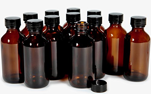 - 12 - 2 oz, Amber Glass Bottles, with Black Lids.