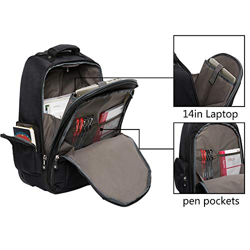 - Plenty of pockets. Thick foam padded compartment of this rolling backpack is big enough for a 14 inch laptop. Outer pocket can hold daily necessary stuff like keys, pens, flashdrivers.