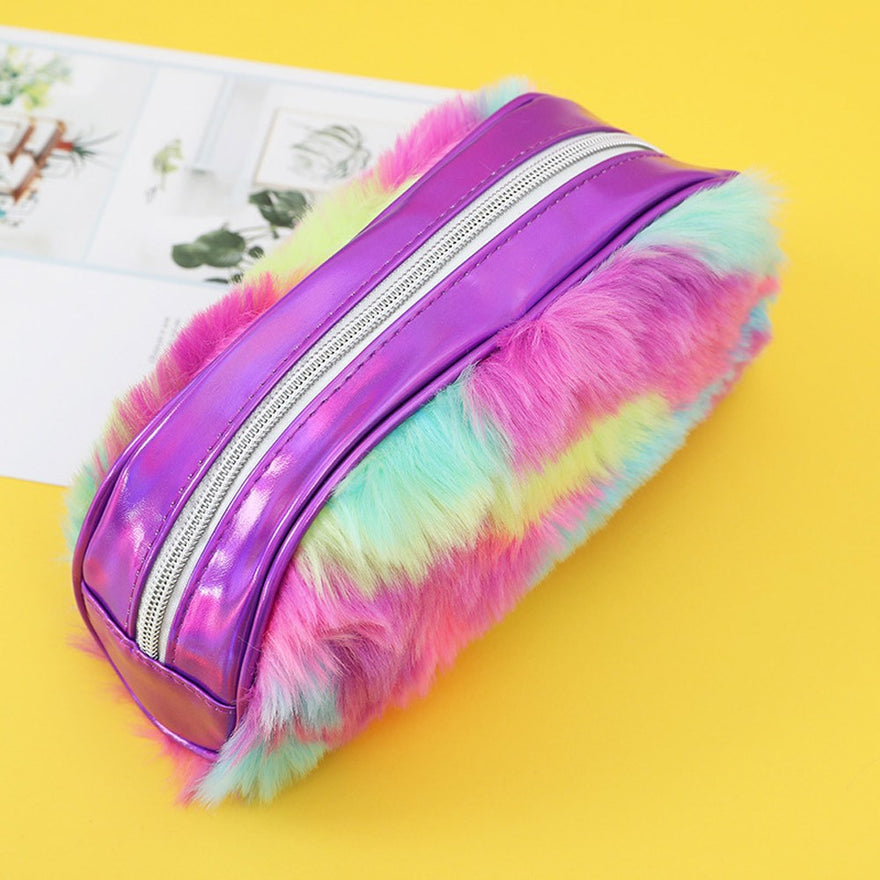 Women Student Faux Fur Laser Zipper Clutch Bag Makeup Cosmetic Pouch Pen Bag