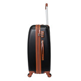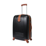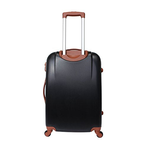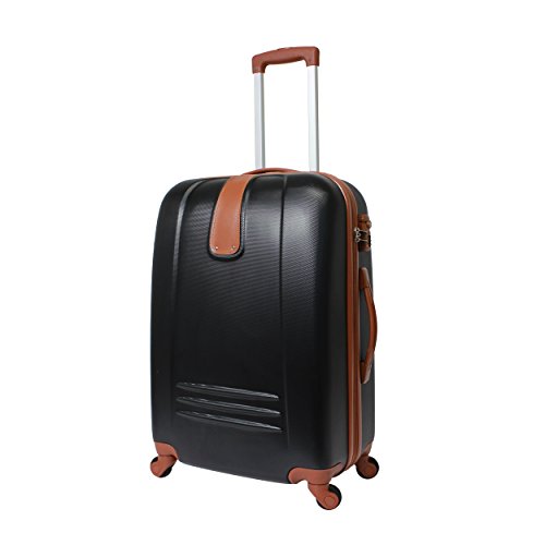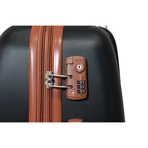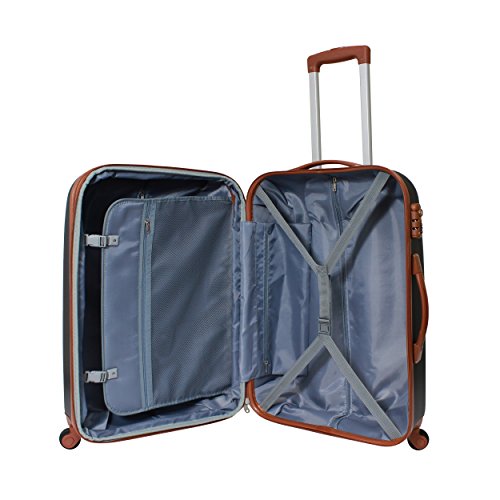 - ABS with brown trim construction, fully lined interior, dual interior compartments, large mesh pocket, compression straps, one small accessory pocket, built-in TSA three-digit combination lock, spinner wheels, push-button telescopic handle, silver pewter hardware, padded top and side grip handles