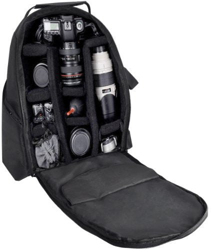 Details: The Xit XTBP Deluxe Camera/Video Padded Backpack is a convenient way to hold all your photographic equipment in full comfort with all the weight spread out comfortably on your shoulders and back. It features a padded carrying handle and 2 Rubber feet. It has a webbed side pocket and a Velcro strap above for carrying a small tripod. It also features a padded, zippered side pocket for a water bottle or other accessories. It has fully padded shoulder straps for extreme comfort and 7 inside dividers to custom fit your camera equipment. It also has a Velcro inside pocket for filters or other accessories. Black