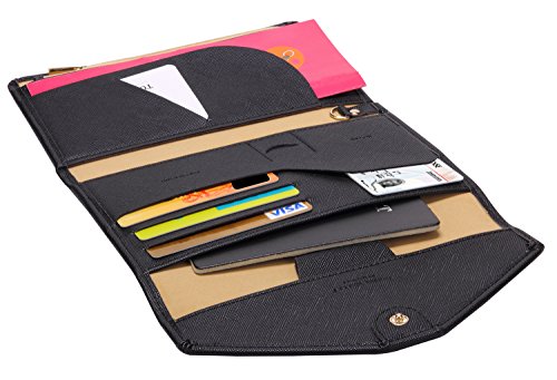 - Travel Organized - Roomy and Collected, 1 passport pocket, 1 boarding pass compartment, 3 credit cards slots, 1 id slot, 1 sim card pouch, 1 coupon ticket slot, 1 cellphone pouch (max 5.8 inches), 1 money & coins zippered pocket (fit U.S. money), 1 key holder and 1 pen holder, 1 slim pocket